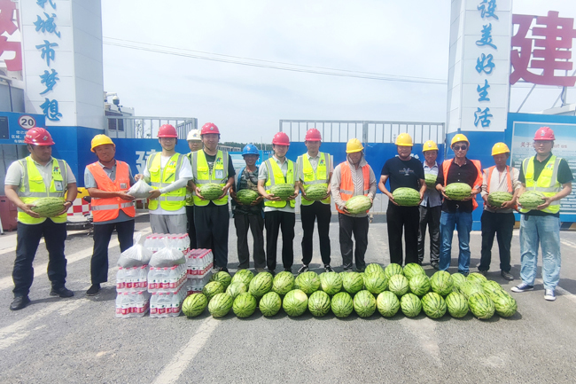 烈日炎炎、驕陽似火,進(jìn)入7月以來,連續(xù)多日發(fā)布高溫橙色預(yù)警,為做好高溫期間安全生產(chǎn)工作,保障現(xiàn)場施工安全,匯通集團(tuán)分會(huì)組織開展“夏送清涼”慰問一線活動(dòng),深入工地、走近工友,把清涼送到施工一線、把關(guān)懷送到職工心坎里。 7月6日,分管經(jīng)理袁鵬、綜合辦公室主任馬婕帶領(lǐng)匯通集團(tuán)分會(huì)小組走進(jìn)項(xiàng)目部,開展“夏送清涼”慰問一線活動(dòng),為每個(gè)施工班組送上清熱解渴的礦泉水、西瓜、綠豆等防暑降溫物資,對(duì)炎炎夏日奮戰(zhàn)在一線的廣大職工及勞務(wù)人員表示親切慰問,叮囑一線人員要保證人身安全,適當(dāng)科學(xué)合理安排作息時(shí)間,根據(jù)氣溫情況,避開高溫時(shí)段,切實(shí)做好防暑降溫工作,同時(shí)要求各施工隊(duì)伍堅(jiān)持“安全高于一切、質(zhì)量重于泰山”理